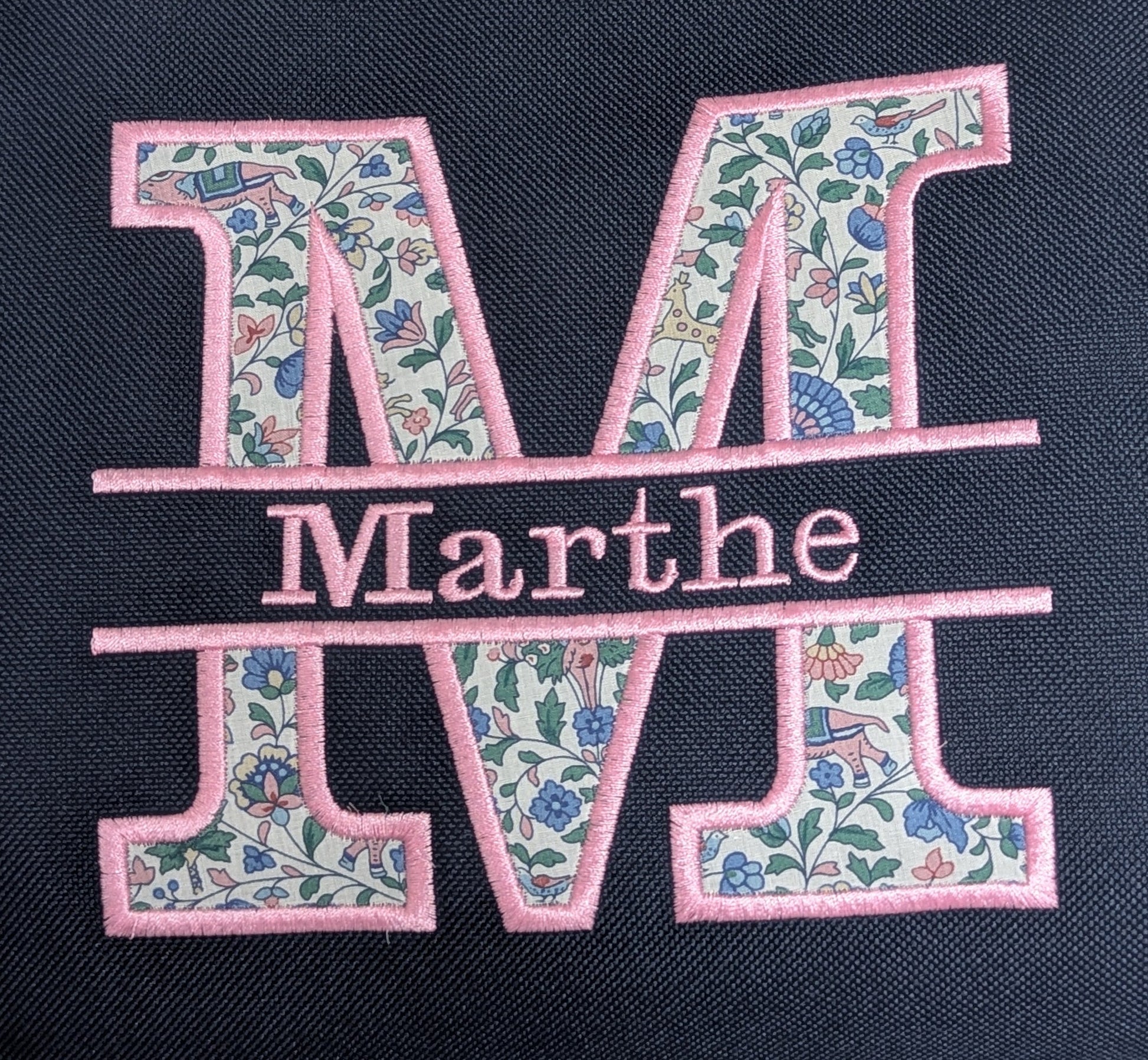Poppy - Personalize a one-of-a-kind piece with your chosen name and thread color for a special touch. The first letter is filled with the fabric of your choice from a large range of beautiful fabrics. Be creative!
